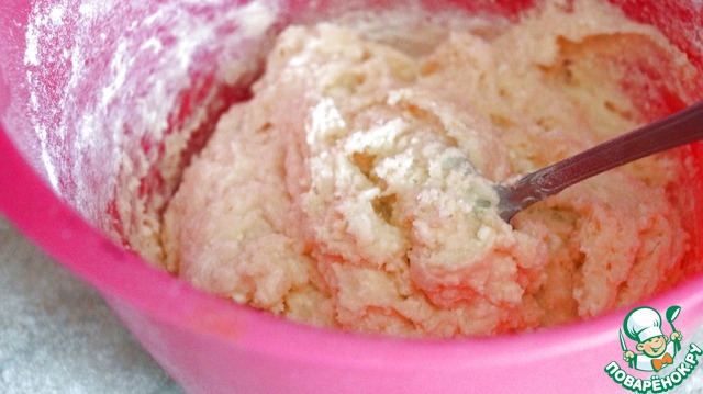 Во взбитую массу добавляем творог, муку, крахмал и разрыхлитель. Тесто получается липкое и вязкое.