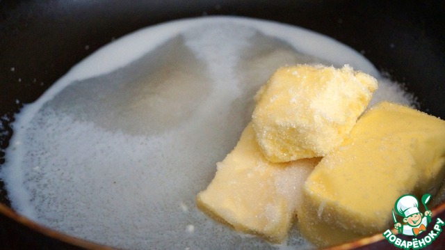 Готовим карамель. На сковороде нагреваем сливочное масло с молоком и сахаром. До растворения сахара.