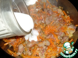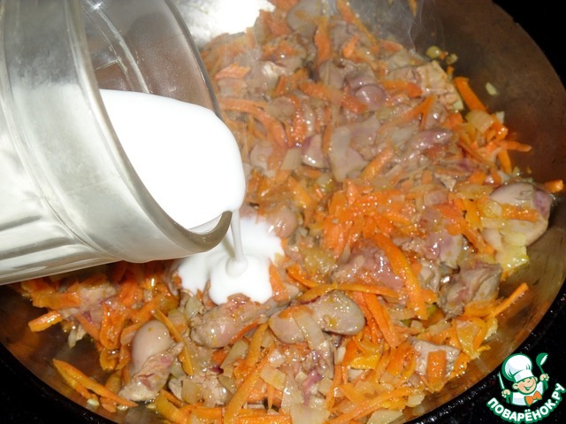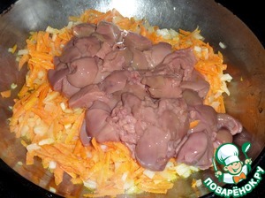 Затем добавляем нарезанную куриную печень. Перемешиваем. Готовим 2-3 минуты.
