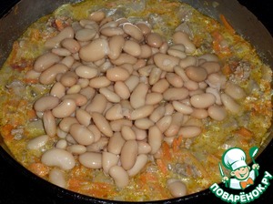Добавляем консервированную фасоль. Перемешиваем. Начинка готова.