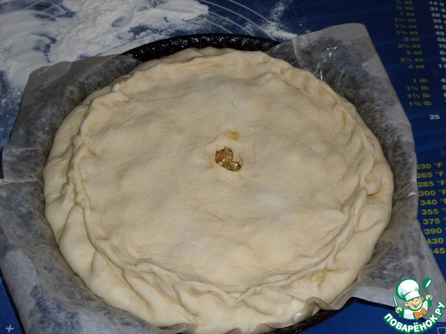 Раскатываем вторую часть теста и накрываем начинку. Защипываем края. Накрываем форму полотенцем и оставляем на 15-20 минут.