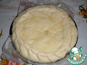 Смазываем пирог яичной смесью (желток +вода + растительное масло) и помещаем в разогретую духовку.