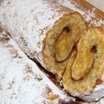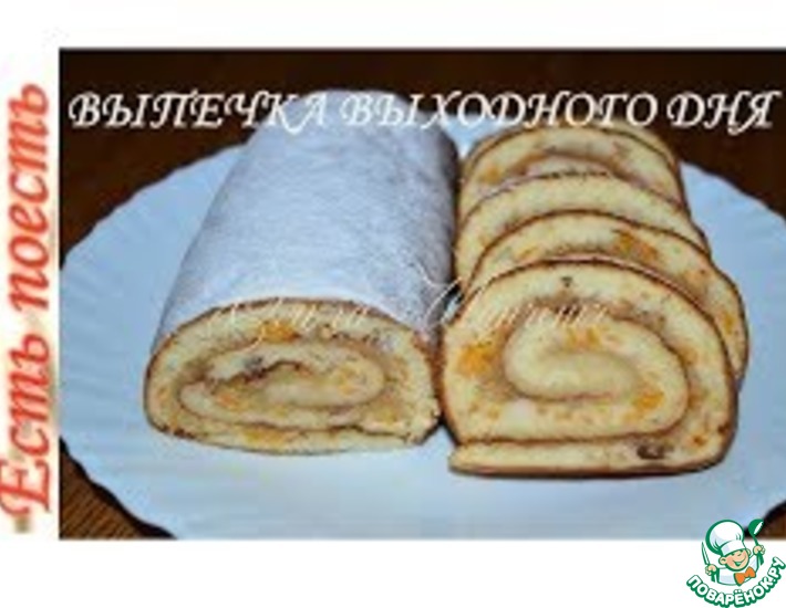 Перевернуть противень с готовым бисквитом на полотенце, убрать бумагу и скатать рулет.