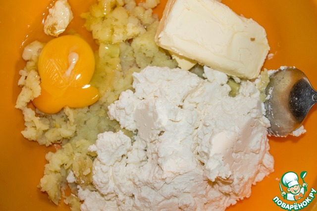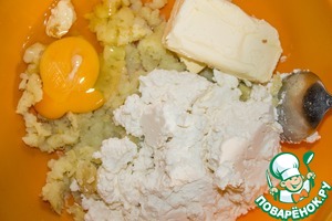 Добавить к картофелю сливочное масло, яйцо, соль и творог. Все тщательно растереть в однородную массу.