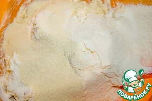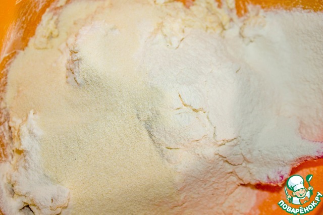 В творожную массу всыпаем манную крупу и просеиваем муку. Замешиваем тесто.