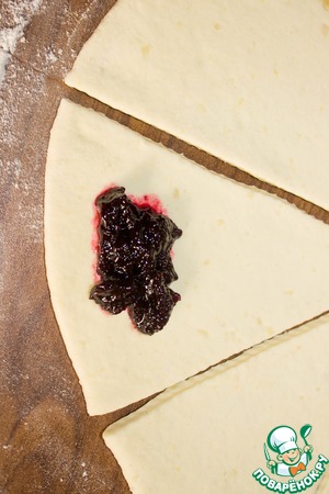 На широкую часть треугольника кладем 1 чайную ложку джема и сворачиваем в рогалик. Края рогалика прищипываем, чтобы джем не убежал.