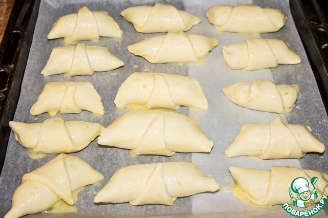 Выкладываем рогалики на выстланный пергаментом противень, смазываем взбитым яйцом и отправляем в духовку.
