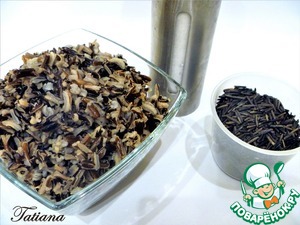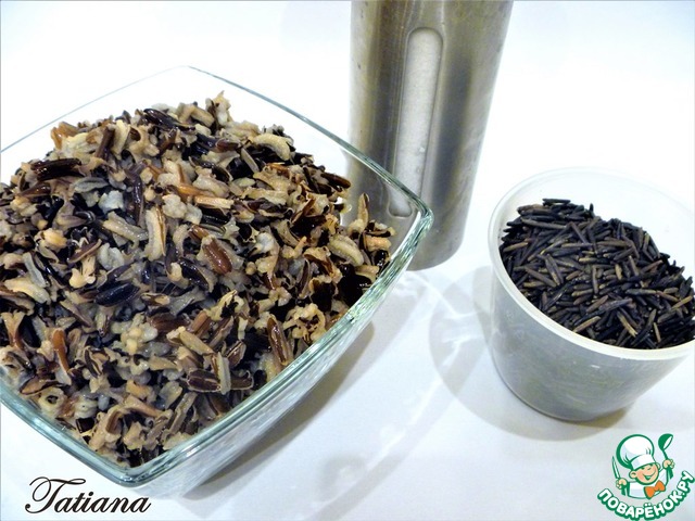 Дикий рис :100 г. риса (стаканчик от мультиварки) промойте, поместите в небольшую кастрюлю, влейте воду в соотношении 1:3 (на один стакан риса---три стакана воды), доведите до кипения, посолите (0,5 ч. л.). Варите рис под крышкой на медленном нагреве 1 час. Готовый рис должен (почти)впитать в себя воду. Если жидкость все таки осталась, слейте её через сито, верните рис в кастрюлю, и оставьте под крышкой до полного остывания. Готовые рисинки, должны полностью раскрыться.