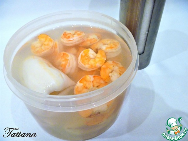 Морепродукты:в небольшой (но широкой) кастрюле вскипятите литр воды + 1 ч. л. соли. В кипящую воду выложите очищенные кальмары и креветки, доведите до кипения, снимите пену. Лимон (1/2 без цедры)нарежьте дольками, добавьте к морепродуктам. Варите морепродукты под крышкой на медленном нагреве 20 мин. Дайте морепродуктам остыть в кастрюле с бульоном и лимонными дольками. Можно так же сварить морепродукты заранее, и хранить в холодильнике (в контейнере. в небольшом количестве бульона)несколько (2-3) дней.