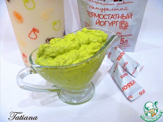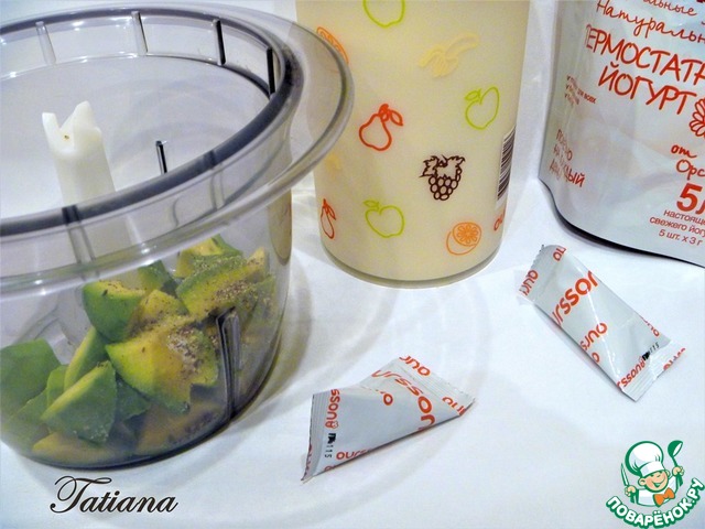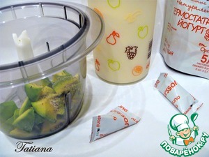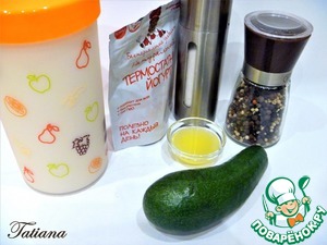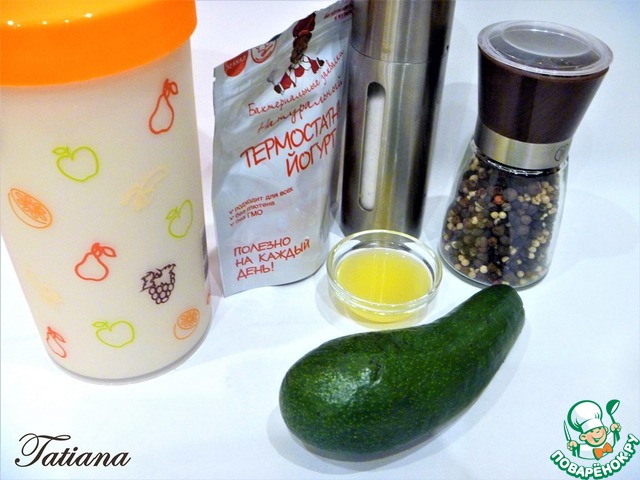Заправка из авокадо и натурального йогурта :авокадо хорошо вымойте, разрежьте пополам. В чашу измельчителя выложите мякоть авокадо, посолите и поперчите по вкусу, добавьте лимонный сок (1 ст. л.) и йогурт. Измельчите смесь в однородную массу.