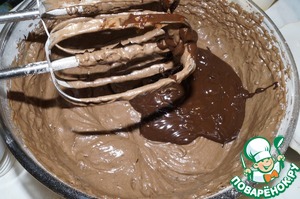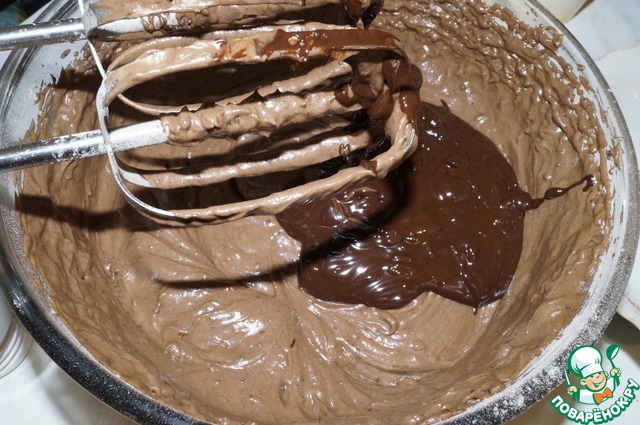 Шоколад растопить и ввести в тесто. Тщательно перемешать, до полного объединения ингредиентов.
