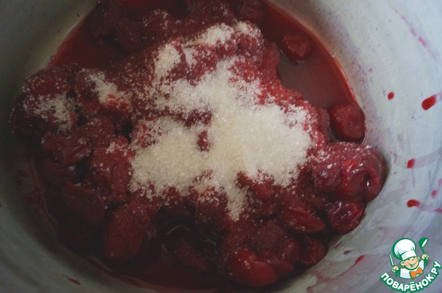 Для начинки: вишни выложить в кастрюлю, добавить сахар и довести до кипения. В воде развести крахмал и влить в вишневую начинку, постоянно помешивая. Проварить до загустения и снять с огня.