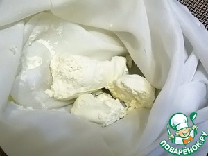 Фильтруем массу через ткань до полного оттока сыворотки. Вот такой он получился.