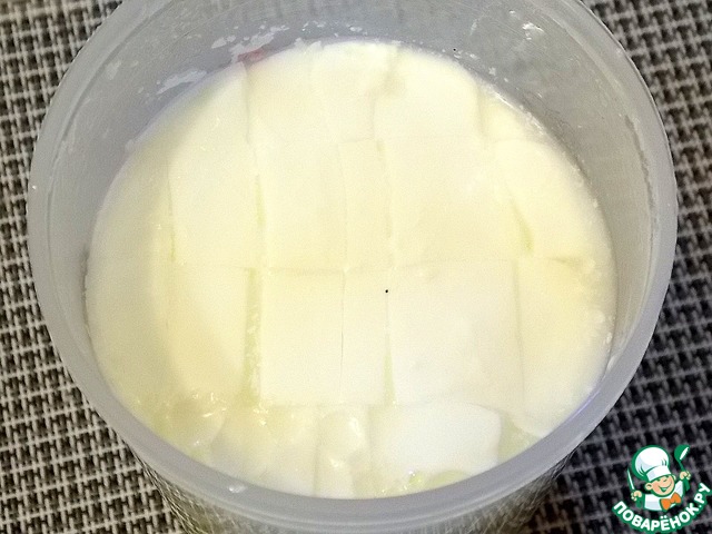 Смешиваем сливки с молоком и нагреваем до t=24*. Вливаем в специальный стакан, всыпаем закваску и хорошенько перемешиваем. Ставим в йогуртницу-термос заполненный кипятком до отметки. Закрываем и оставляем на 8 часов. Затем готовый сгусток режем ножом на кубики. -