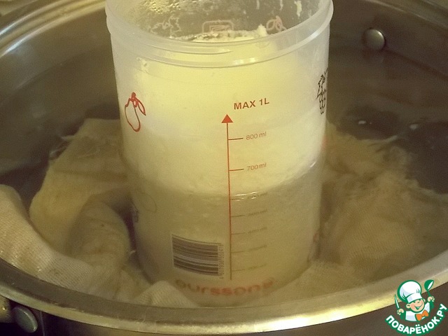 В высокую кастрюлю наливаем воду и кладем на дно ткань. Доводим до кипения и ставим стакан с творожной массой. Нагреваем массу до t=50*и варим в течении 15 минут. За это время сгусток уплотнится.