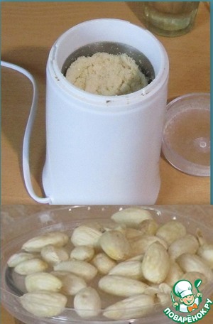 Миндаль зальем кипящей водой на 10 минут и затем очистим от кожуры. Поместим очищенные орехи в кофемолку и измельчим.