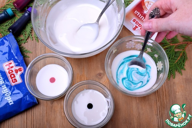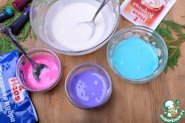 Дадим глазури немного настояться (около 10 минут), а затем добавим красители, чтобы получить желаемые цвета.