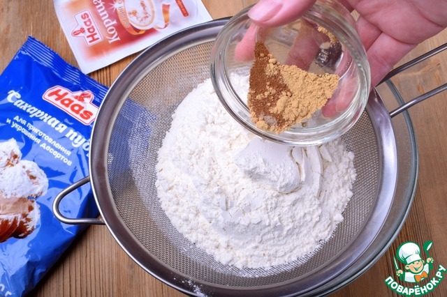 А пока подготовим сухие ингредиенты: в глубокую миску просеем муку, соль, разрыхлитель и смесь пряностей.