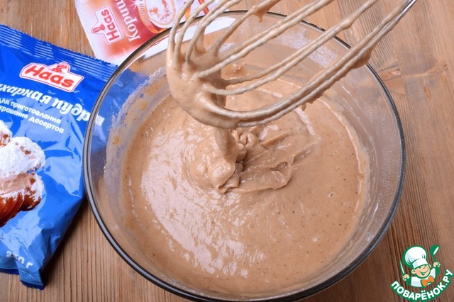 Перемешиваем до получения гладкого однородного теста без комочков сухой муки. Тесто достаточно жидкое, оно лентой стекает с венчика.