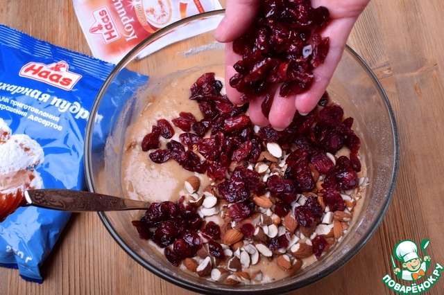 Миндаль крупно порубим ножом и добавим в тесто вместе с вяленой клюквой.