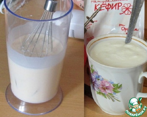 Яйца с сахаром тщательно взбиваем, добавляем кефир, перемешиваем.