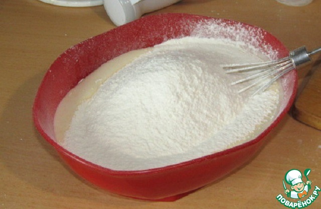 Просеиваем муку в яично-кефирную смесь, аккуратно перемешиваем и добавляем гашеную соду.