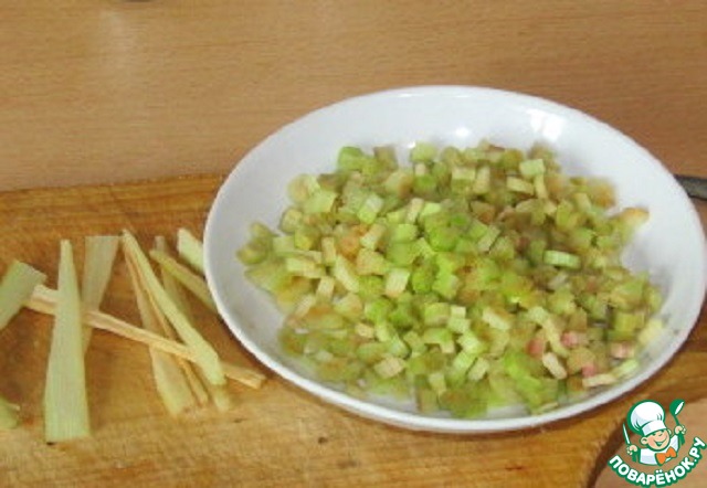 Готовим начинку. Вымытый ревень очищаем от волокнистой пленки, нарезаем на мелкие кубики, посыпаем столовой ложкой сахарного песка.