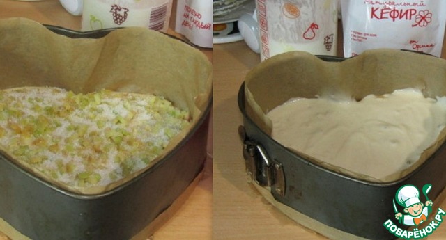 На дно формы наливаем половину теста, насыпаем ревень, затем вторую половину теста. -