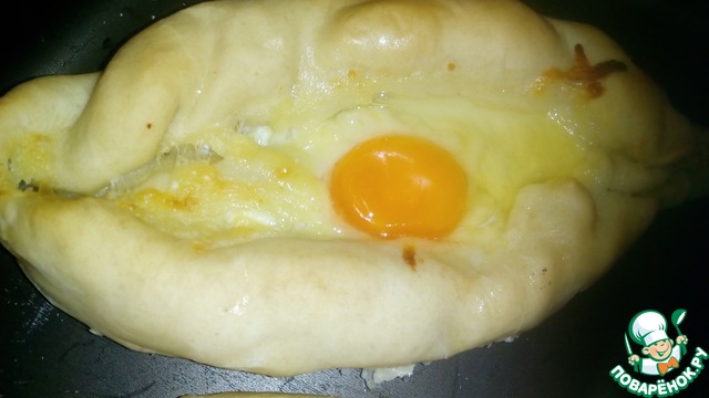 1. Наш хачапури готов. Разбиваем в него яйцо, кладём кусочек масла и подаём к столу.