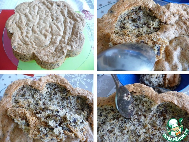 Ложкой вынимать бисквит по всей поверхности коржа на глубину половины столовой ложки, складывать в миску (крошка нам нужна будет для крема).
