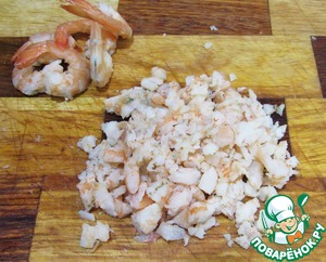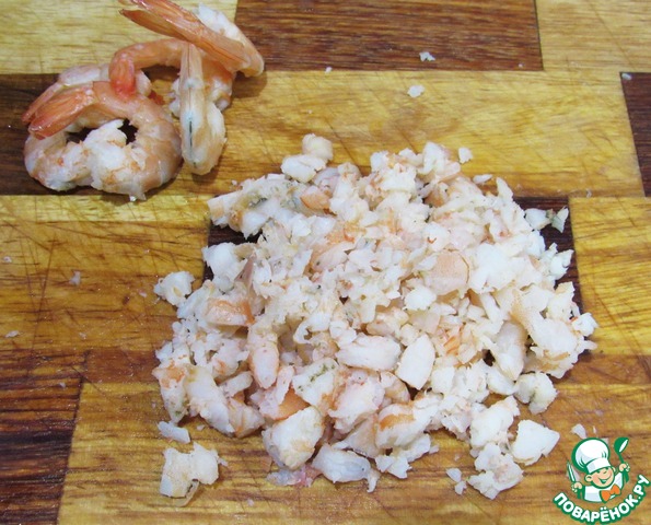 А теперь отвариваем и чистим креветки. Нужно оставить с хвостиком 6 штук (самых красивых) для украшения. Остальные мелко рубим.