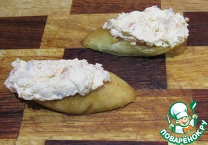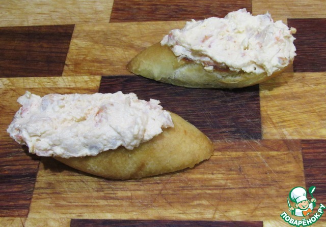 Поджариваем на сливочном масле кусочки багета. Намазывает толстым (не мене половины толщины багета) слоем творожно-креветочной массой.