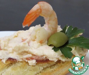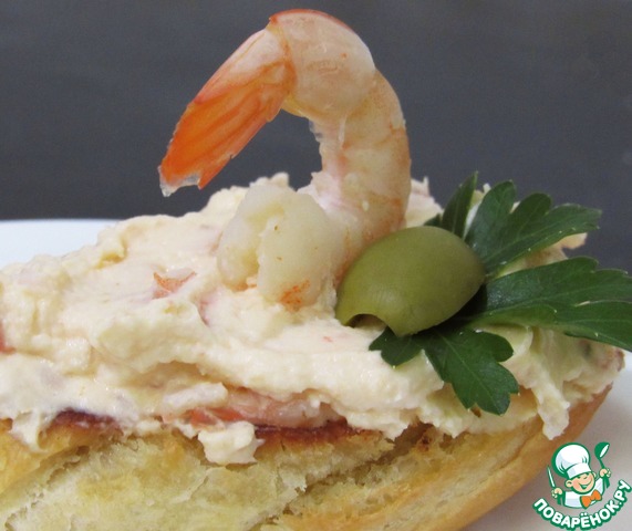 Ну что тут скажешь... Сказать можно только одно: это шикарная закуска. Легкий, похрустывающий крутон, нежная креветка и пикантная, слегка острая, но в то же время мягкая творожная намазка... И если вы хотите удивить и порадовать своих гостей, попробуйте.