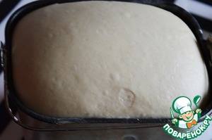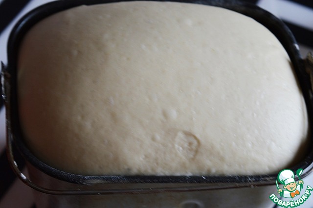 Сначала молоко, сахар и дрожжи вылейте в посуду. После расстаивания дрожжей вылейте остальные ингредиенты, после понемного высыпайте муку, сделайте мягкое тесто. Оставьте примерно на час. Или приготовьте тесто в хлебопечке.