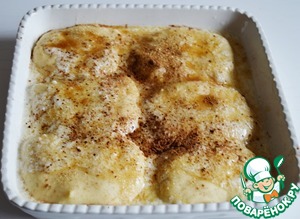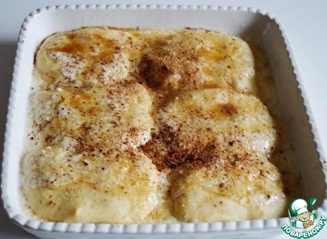 Выложим наши лепешки в противень или форму для запекания. Каждую лепешку руками расплющим. Накроем полотенцем и поставим в теплое место для расстойки. Посыпаем лепешки сахаром с корицей. Выльем заливку на наши лепешки и поставим в духовку на нижнюю полку.