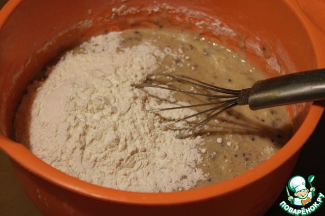Порциями ввести муку и замесить тесто. Муки может потребоваться и чуть меньше либо больше (в зависимости от её свойств). Оно должно быть как сметана.