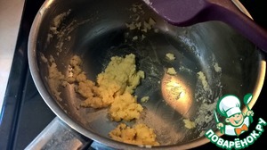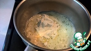 Готовим Бешамель. В сотейнике растапливаем сливочное масло и добавляем 1 ст. л. муки