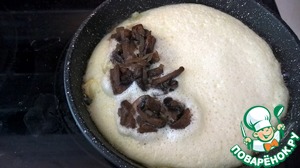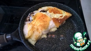 Когда омлет прихватится (нижняя часть уже подрумянилась и держится, а верх еще полужидкий), выкладываем грибы на половину омлета.
