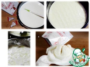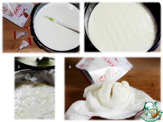 • Немного терпения и вы получаете нежнейший, натуральный, свежайший творог. Закваску размешать в молоке. Поставить заквашиваться при постоянной температуре 22-24 градуса на 6 часов. Я делаю это в мультиварке Oursson. После порезать на квадраты и нагреть на водяной бане минут 15 до отделения сыворотки. Откинуть на застеленный тканью дуршлаг. Отцедить сыворотку.
