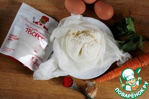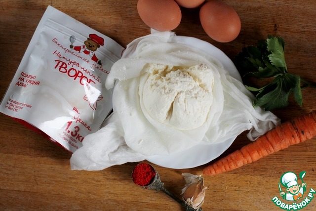Всё любимое: творог, морковь, хлебцы, паприка. Из зелени взяла петрушку и укроп (сельдерей не нашла). Не солила, творог взяла покупной.