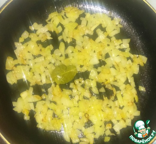 Добавить нарезанный лук и лавровый лист. Обжарить до золотистого цвета лук. Снять с огня, убрать лавровый лист. -