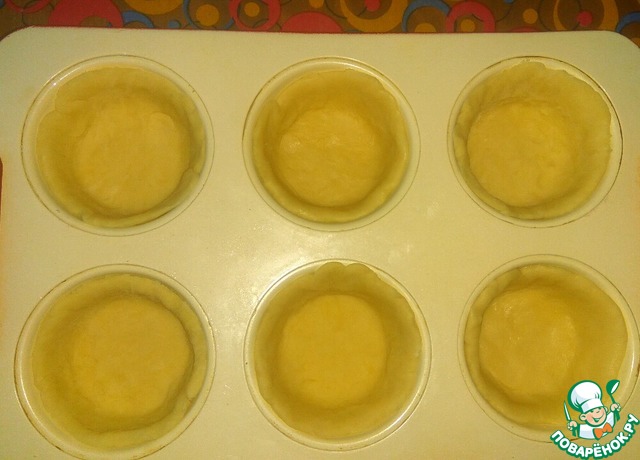 Выложить круги теста в формочки, сформировать корзиночки, хорошо прижимая дно и бортики к формам. Поставить в холодильник на 10 минут. -
