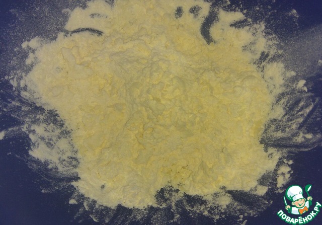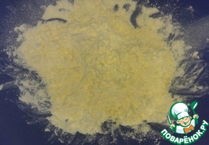 В миске соединить муку, соль и нарезанное холодное сливочное масло. Перетереть руками в крошку.