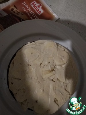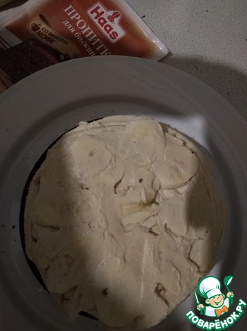 На бисквит выложить 1/3 крема, сверху кружочки банана, Накрыть вторым коржом, промазать 1/3 крема, сверху опять банан. Покрыть 3-м коржом.