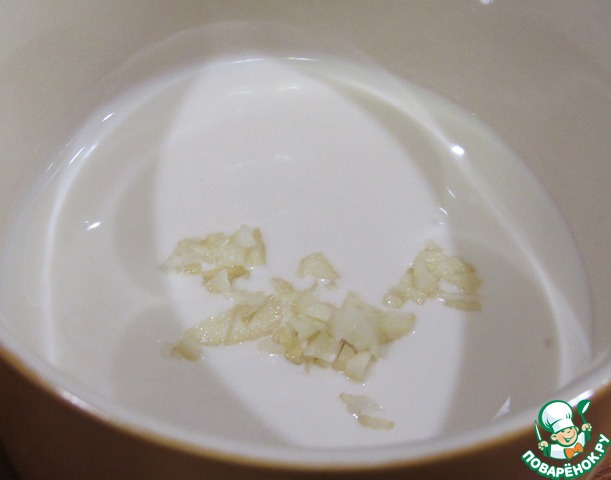 Чеснок мелко рубим и обжариваем несколько минут на оливковом масле. Остужаем, добавляем в ряженку. перемешиваем -