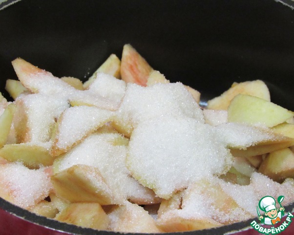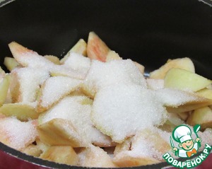 Высыпаем яблоки в сотейник, добавляем сахар и притушиваем под крышкой до размягчения.