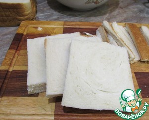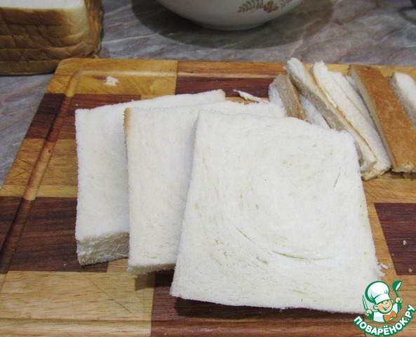 - Хлеб (Тостовый. В зависимости от размера формы понадобится 15-20 шт) — 15 ломт.