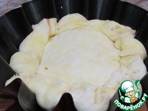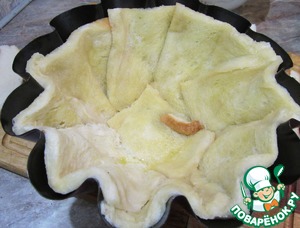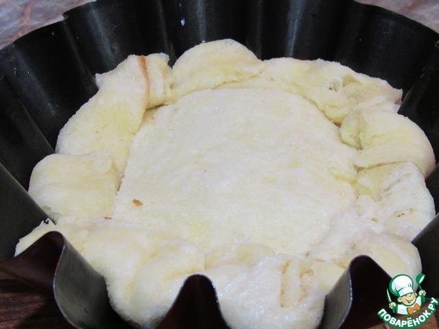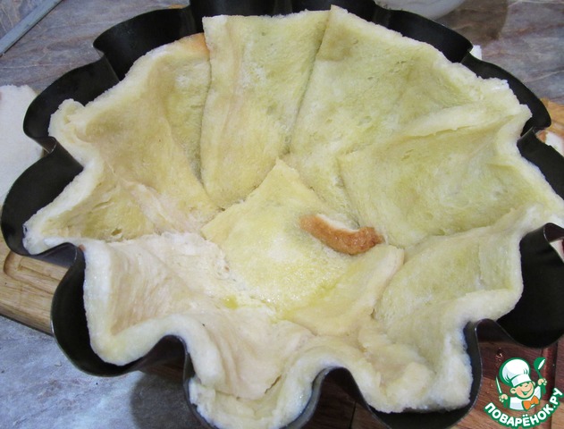 Теперь пропитываем наши тосты маслом и обкладываем ими форму. Кладем внахлест и прижимаем к форме. Самое главное, чтоб между кусками хлеба не было прогалов. Если есть небольшие прорехи, их можно заложить маленькими кусочками. И чем лучше хлеб будет пропитан маслом, тем процедура пройдет удачнее.