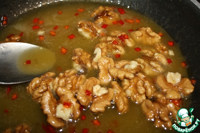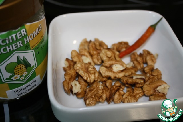 Итак, нам понадобится мед, орехи и перчик чили.