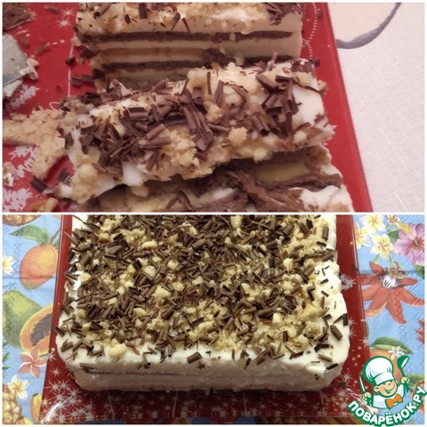 В форму (желательно силиконовую) 20*10*6=1 литр., влейте не большое количество ряженковой массы (~ 1 см. толщиной). Поверх ряженки положите шоколадные печенья, поверх печенья влейте еще слой ряженки, и так чередуйте пока форма полностью не заполнится (у меня получилось четыре ряда печенья и ~ литр ряженковой смеси).